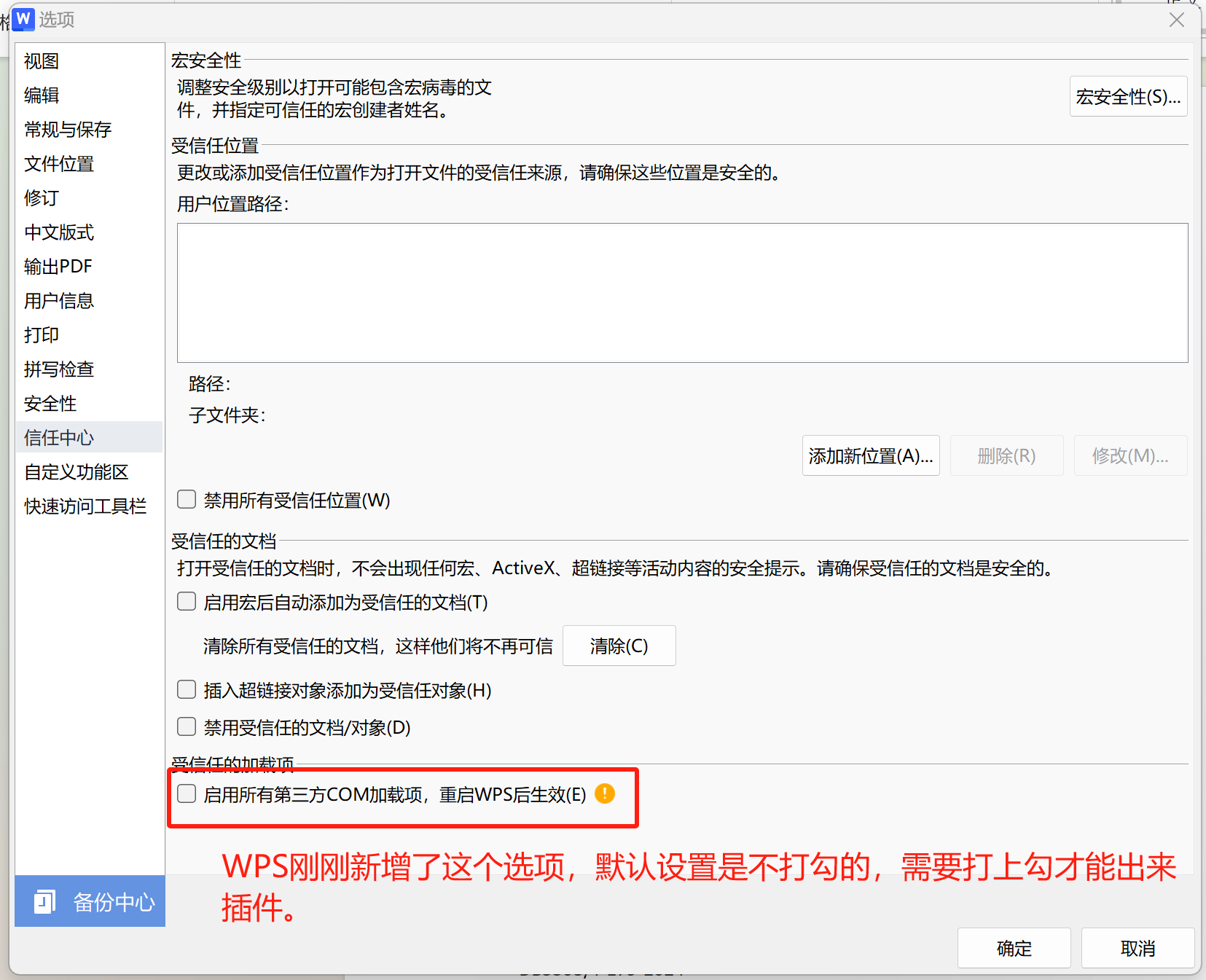 - 打开 WPS → 点顶部的【文件】→ 选【选项】→ 找到【信任中心】→ 点开【信任中心设置】→ 把启用第三方插件勾上。 (老版本WPS没有这个选项,直接跳过这步就行)